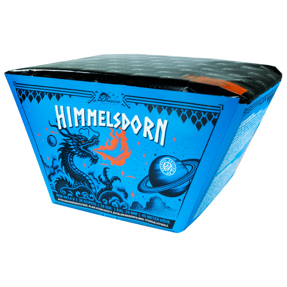 Gefächerte rotblinkender Weidenaufstieg zu blauen Sternbukets mit rotblinkenden-Weidenpalmen mit Titan-Salutfinale.