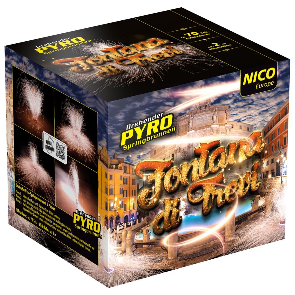 La dolce vita trifft auf pure Feuerwerkskunst! Mit der FONTANA DI TREVI entdecken Sie einen Hauch italienischer Eleganz – ein wahres Kunstwerk aus Feuer und Bewegung! Der wunderschöne, sich drehende Springbrunnen mit 8 Brändern.