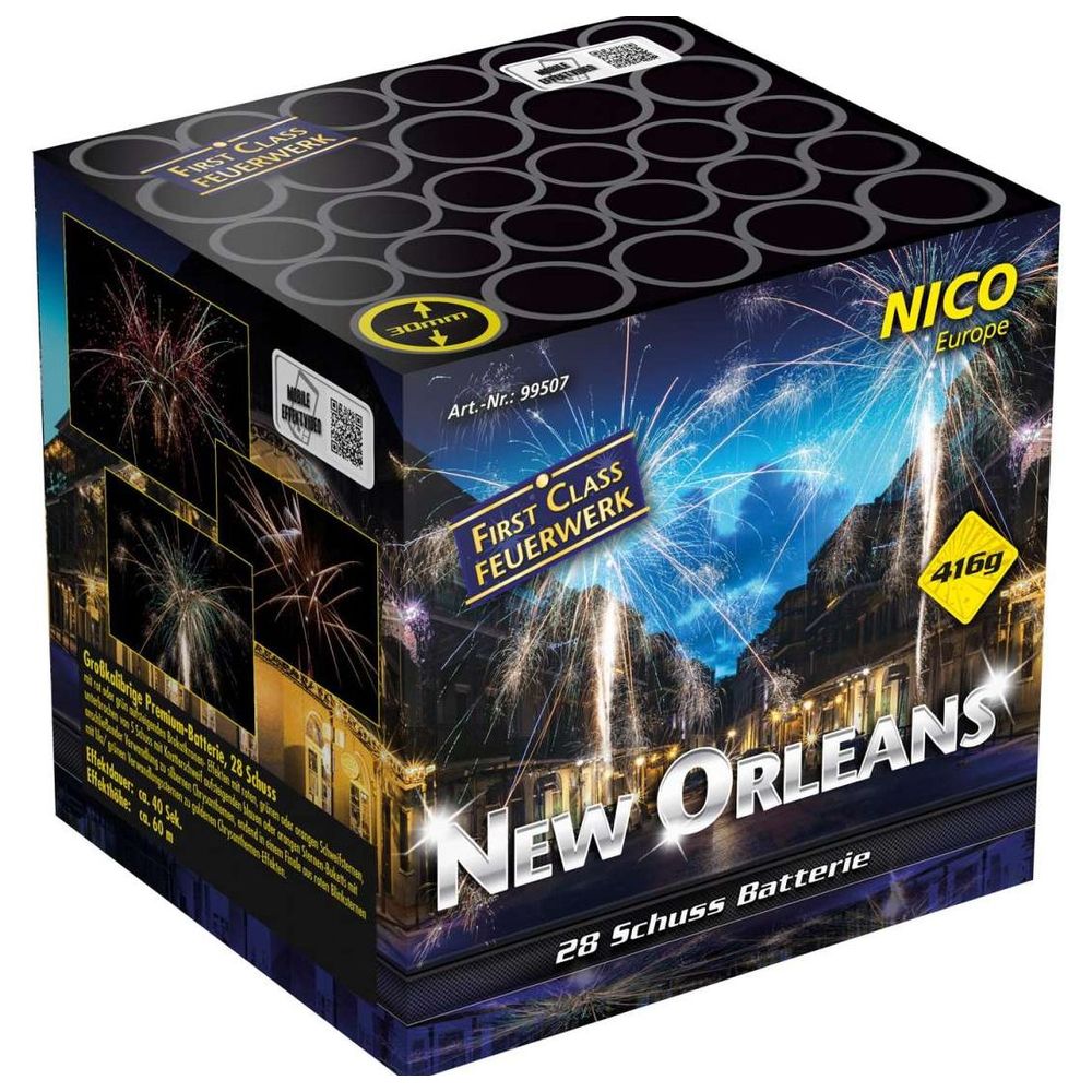 Rote und grüne Schweifaufstiege zu Gold-Brokat-Kronen mit roten Schweifsternen. Knatterschweife mit Sternbuketts in Blau und Orange. Rote Blinksterne mit lila und grünen Verwandlungssternen und goldene Chrysanthemen. Mit Final-Salve.