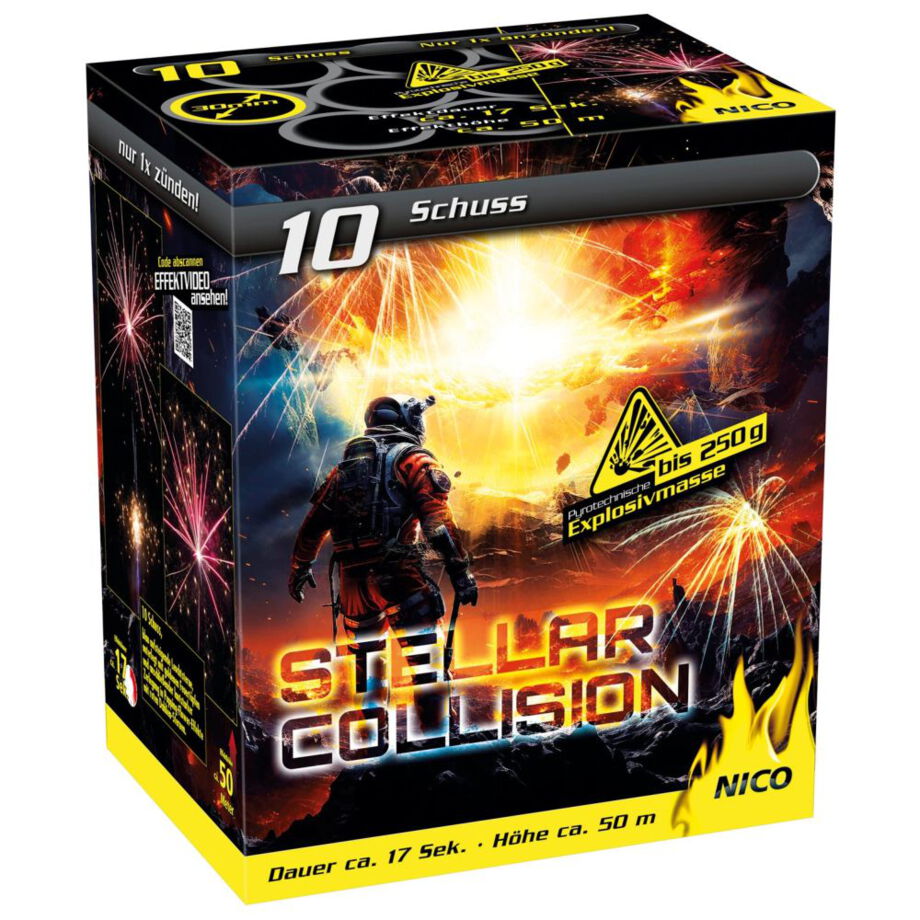Blau aufsteigende Leuchspursterne, unterlegt mit goldenen Feuertöpfen und anschließender lautstarker Zerlegung in Popping-Flower Crackling-Effekte mit roten Dahlien-Sternen.