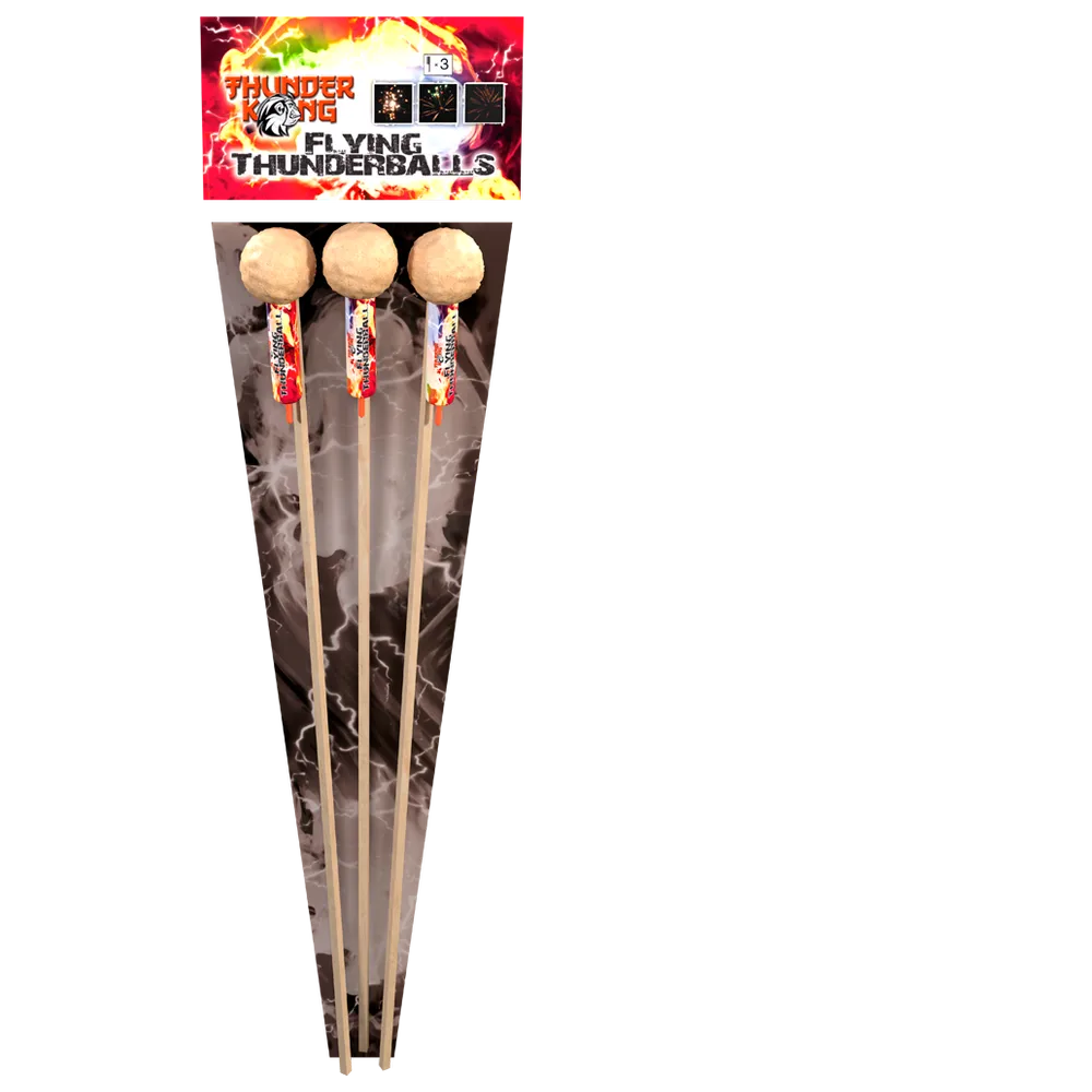 Die 3 Flying Thunderballs sind drei spektakuläre Raketen, jede mit einem dicken Burst! Von der leuchtenden Crown über die goldene Coco bis hin zu den Crackling Strobes. Maximale Effekte!